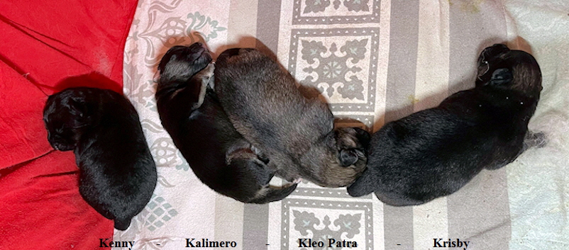 At the beginning of the year, Eyleen and Wunjo met in our garden and weren't deterred by the snow. They clicked immediately, and true to Wunjo's unconventional nature, the two found each other on the steps next to our fire pit. We're keeping our fingers crossed for Eyleen that her pregnancy is stress-free and that healthy puppies in grey-clouded and black & tan will be born in early March. On March 9, 2026, Eyleen gave birth to four healthy puppies: three males and one female. First up was the grey-clouded Krisby, a real bruiser weighing in at 300g. After the biggest of the litter had paved the way for his siblings, grey-clouded Kleo Patra arrived, weighing 261g. Next came the black and tan Kalimero, weighing 270g, and finally, the black and tan Kenny, weighing 279g. We wish Carola and Volker much joy in raising the puppies and look forward to visiting them before they go to their new homes. Wurfstärke: 1 Hündinnen und 3 Rüden in Grey-shaded (1/1) and Black and Tan (2/0) ![]() Eyleen und Wunjo (© Zuchtstätte von der Roßsteige) ![]() Welpen Tag 5 (© Zuchtstätte von der Roßsteige) |